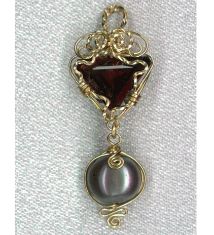 Fun & chunky 14K yellow gold wire wrap pendant with faceted Garnet and fine grey Pearl.