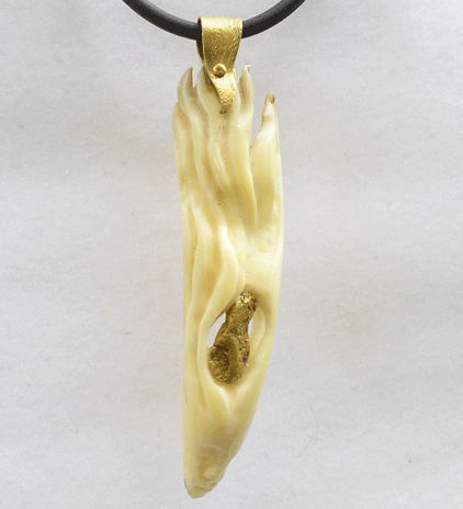 A carefully textured 22K gold bail for a very unique carving with gold nugget inside.