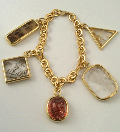 18K yellow bracelet with custom bezels. All stones are one of a kind and various types of included quartz.