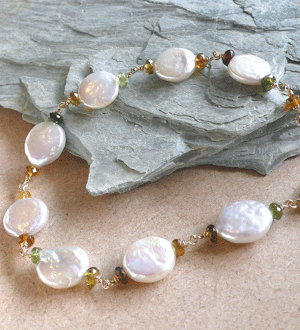 Beautiful white coin pearls with the many shades of Tourmaline framing each. 14KY gold.