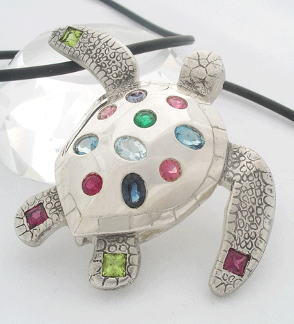 This is a grandmother's brooch and pendant. The four children are on the flippers, with all the grandchildren on the shell. Hand carved sterling silver.