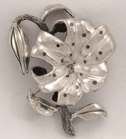 Hand carved tiger lily brooch with black diamonds, sterling silver.