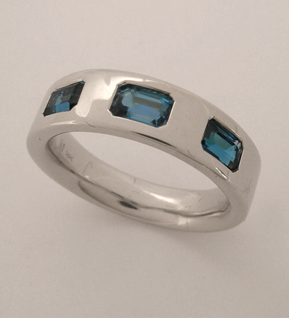 18K white gold wedding ring with three brilliantly blue Topaz.